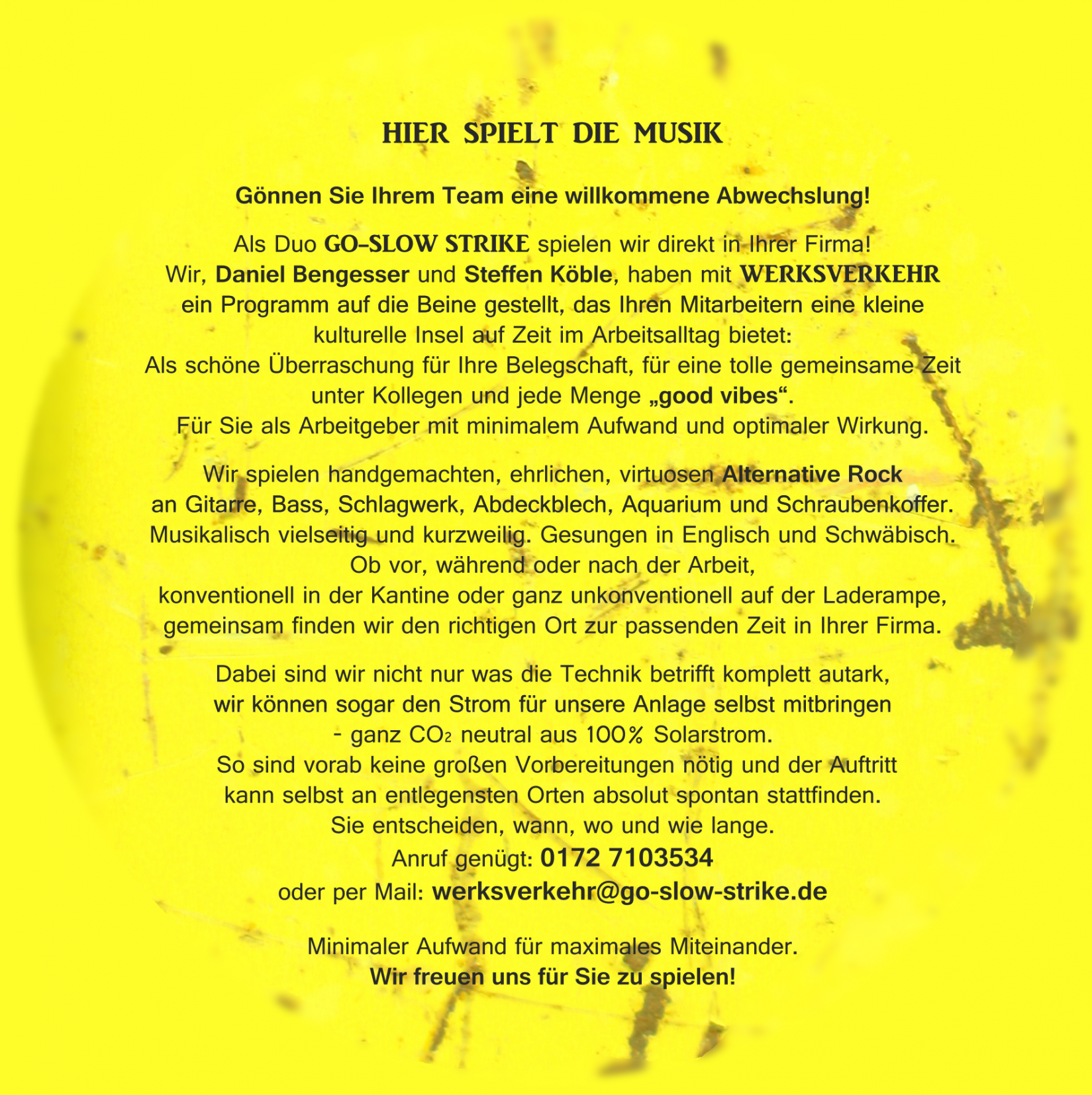 Das Duo GO-SLOW STRIKE mit Daniel Bengesser und Steffen Köble hat sich genau das zum Vorsatz genommen und spielt Songs von Daniel Bengesser in entspannten Versionen ohne viel technischen Aufwand.